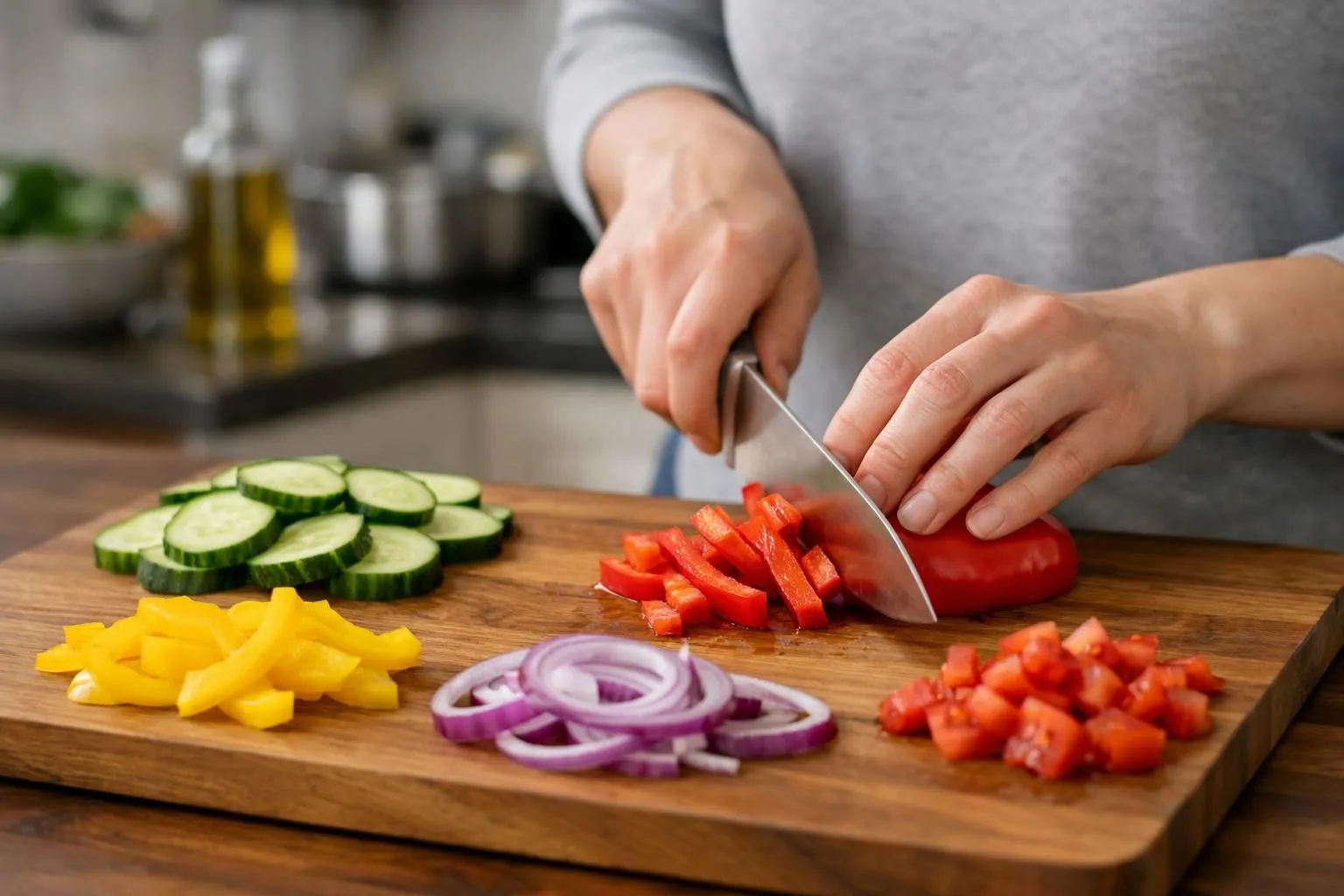 La coupe en julienne garantit une cuisson uniforme. Taillez vos poivrons, courgettes et carottes en bâtonnets de même épaisseur.